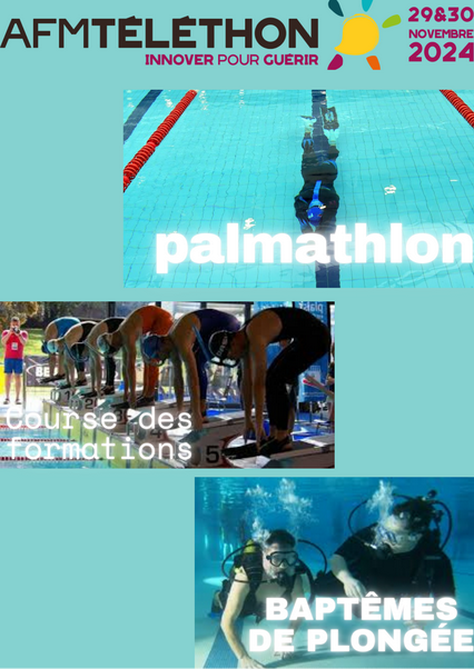 Cette année, le club organise des animations pendant le téléthon. Le but est bien entendu de récolter de l’argent pour faire avancer la recherche sur les maladies génétiques et améliorer le quotidien de ceux qui ont eu la malchance de naître avec une maladie génétique. Nous, membres du club, allons mettre nos muscles au service de cette cause. Alors, à vos palmes pour : Un palmathlon nouvelle formule ; chaque adhérent du club est invité à “vendre” ses longueurs de nage palmée à ses amis, sa famille, ses collègues… Les dons seront remis dans une urne disposée à la piscine le samedi 30/11. Un challenge inter-groupes de formation : quel groupe va réaliser la plus grande longueur en nage avec palmes ? Venez les encourager et faire un don. Une ligne d’eau sera consacrée aux baptêmes de plongée. Vous pouvez venir aider, même si vous ne pouvez pas encadrer (distribution des PMT, gréage des blocs…). Une buvette pourra être organisée. Vous pouvez confectionner des gâteaux pour cette buvette. Contactez vos encadrants pour vous inscrire mais aussi Emmanuelle Vignier (ou Rodolphe Leliard) si vous voulez vous engager dans l’organisation. ejuvignier@gmail.com ou r.leliard@autonomie-dh.fr Nous comptons sur vous tous !