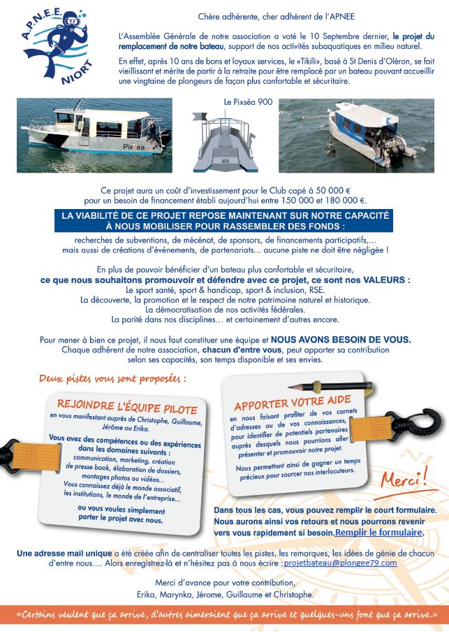 Notre vaillant Tikili, âgé de plus de 50 ans, et au club depuis 10 ans, nous permet certes de faire de belles plongées, mais il est temps de penser à son successeur. Tout est dit dans le fichier pdf que vous trouverez en pièce jointe, après c'est à chacun de nous de jouer !